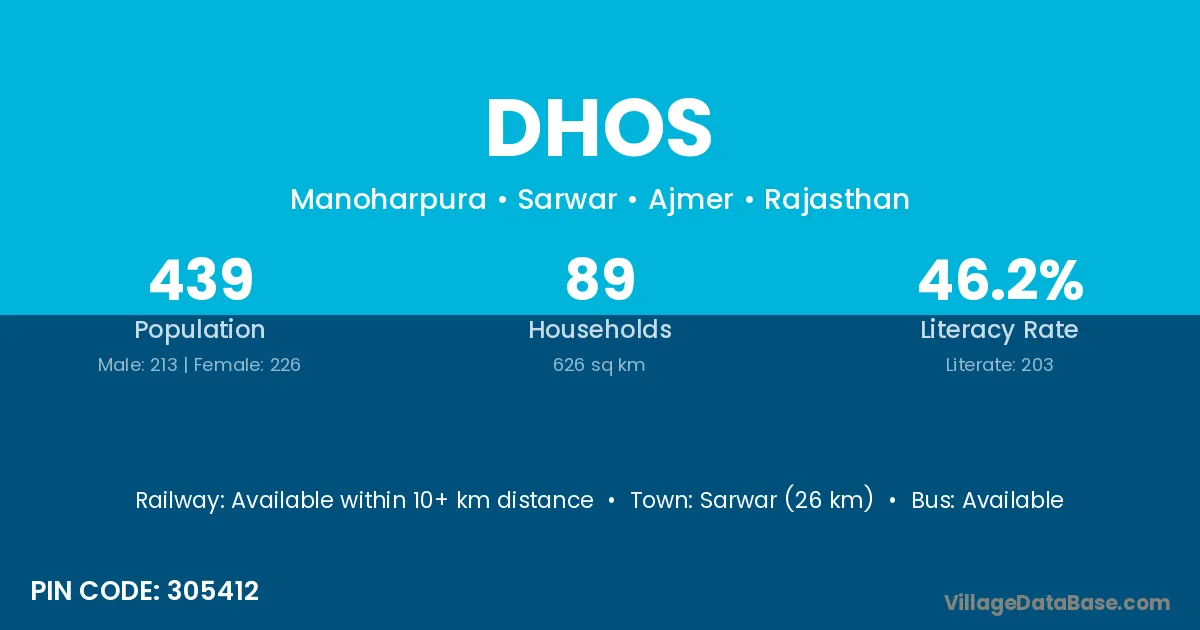 Sarwar (26 km) is the nearest town to Dhos village for major economic activities and is located approximately 26 km away.