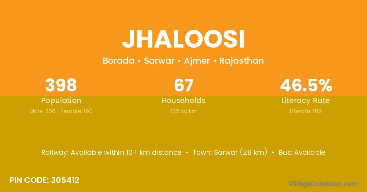 Sarwar (26 km) is the nearest town to Jhaloosi village for major economic activities and is located approximately 26 km away.