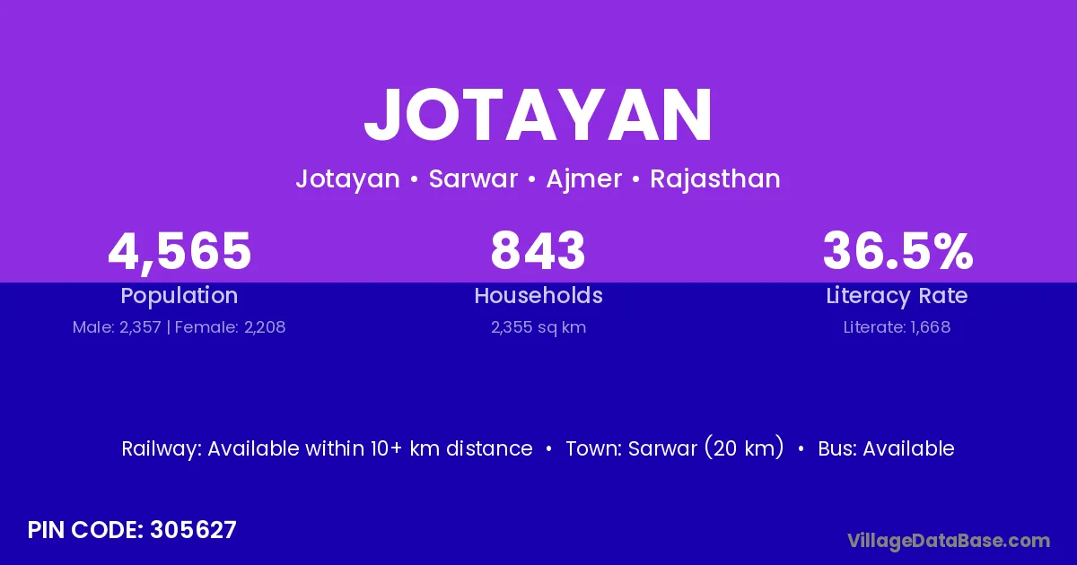 Sarwar (20 km) is the nearest town to Jotayan village for major economic activities and is located approximately 20 km away.