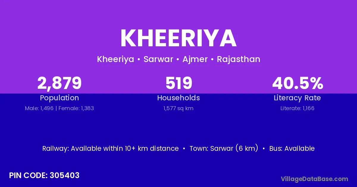 Sarwar (6 km) is the nearest town to Kheeriya village for major economic activities and is located approximately 6 km away.