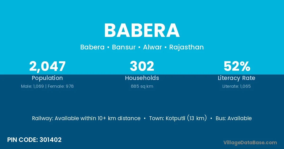 Kotputli (13 km) is the nearest town to Babera village for major economic activities and is located approximately 13 km away.