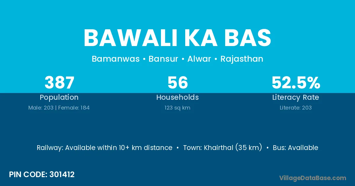 Bawali Ka Bas village has a total population of 387 people, of which 203 are males and 184 are females.