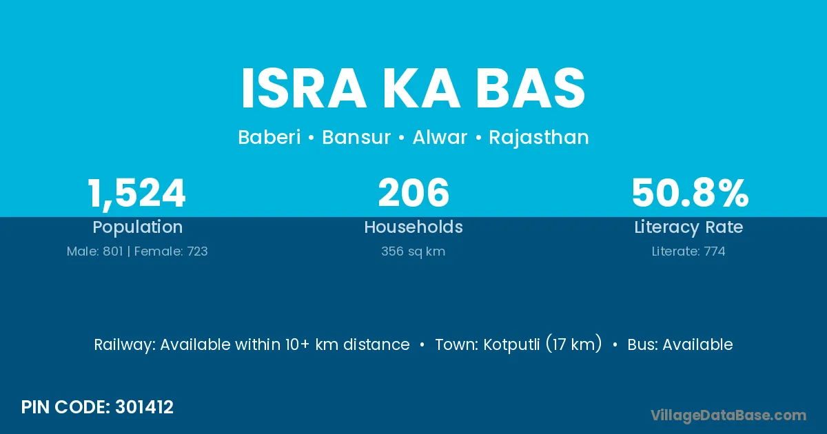 Kotputli (17 km) is the nearest town to Isra Ka Bas village for major economic activities and is located approximately 17 km away.