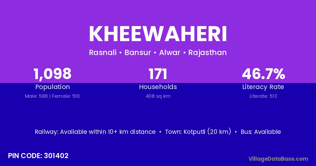 Kotputli (20 km) is the nearest town to Kheewaheri village for major economic activities and is located approximately 20 km away.