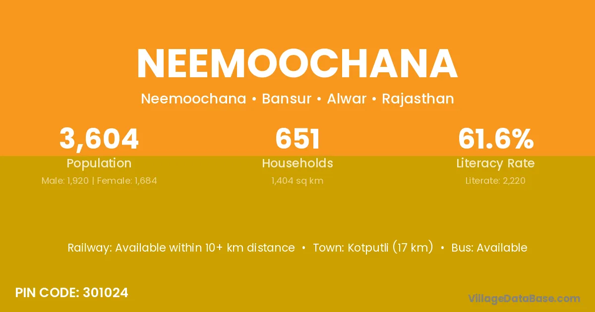 Kotputli (17 km) is the nearest town to Neemoochana village for major economic activities and is located approximately 17 km away.