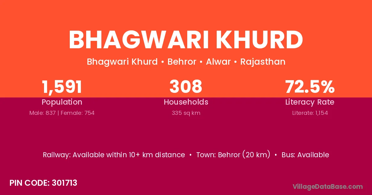 Behror (20 km) is the nearest town to Bhagwari Khurd village for major economic activities and is located approximately 20 km away.