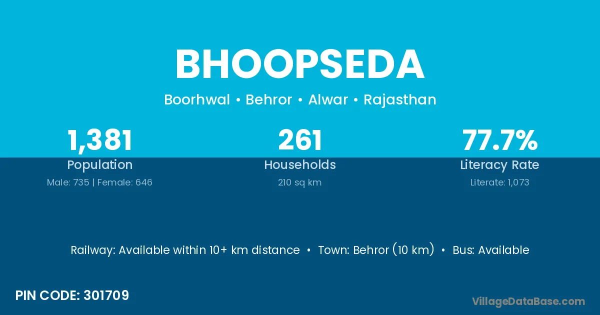 Behror (10 km) is the nearest town to Bhoopseda village for major economic activities and is located approximately 10 km away.