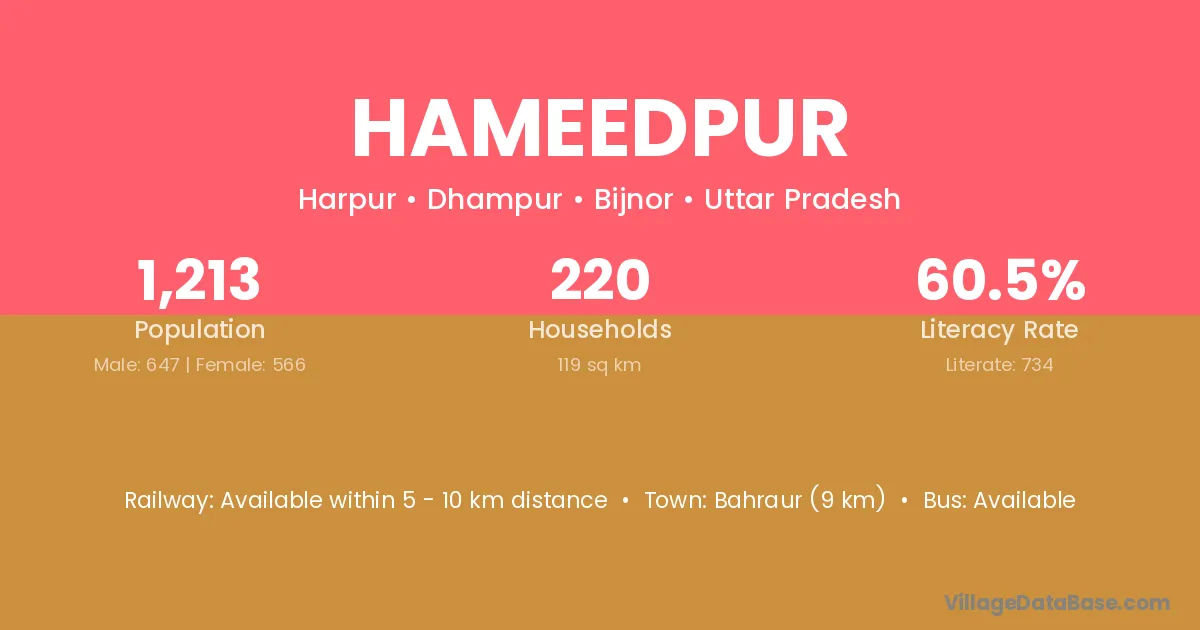 Behror (3 km) is the nearest town to Hameedpur village for major economic activities and is located approximately 3 km away.
