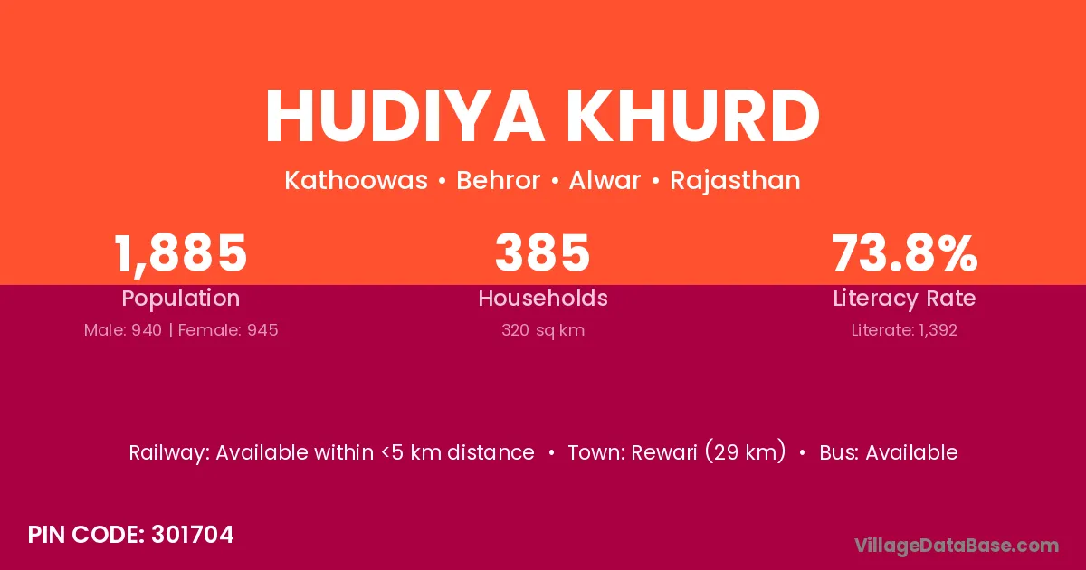 Hudiya Khurd village has a total population of 1,885 people, of which 940 are males and 945 are females.