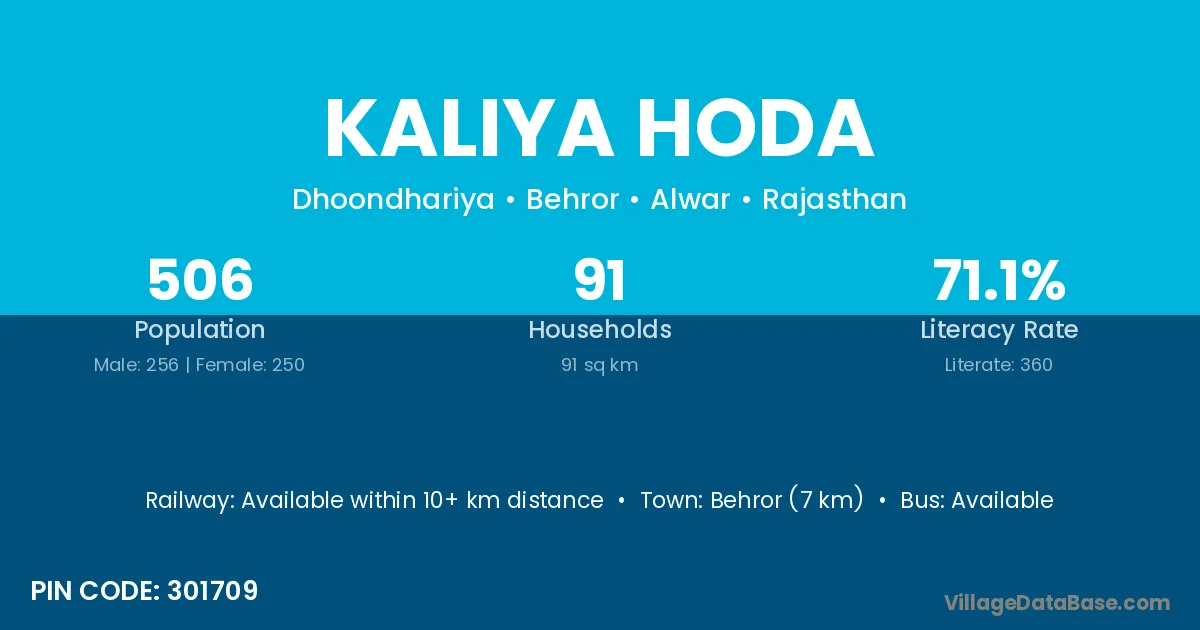 Behror (7 km) is the nearest town to Kaliya Hoda village for major economic activities and is located approximately 7 km away.