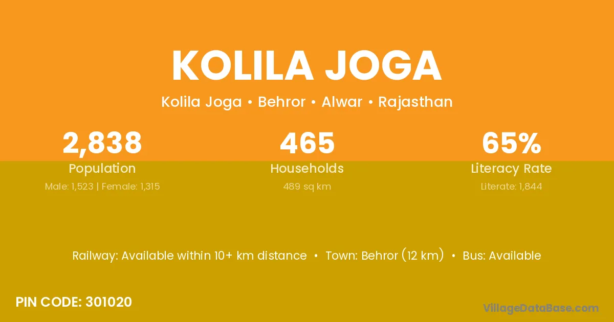Behror (12 km) is the nearest town to Kolila Joga village for major economic activities and is located approximately 12 km away.