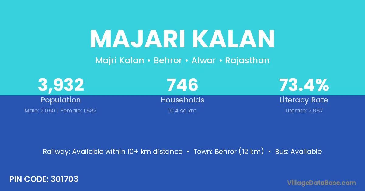 Behror (12 km) is the nearest town to Majari Kalan village for major economic activities and is located approximately 12 km away.