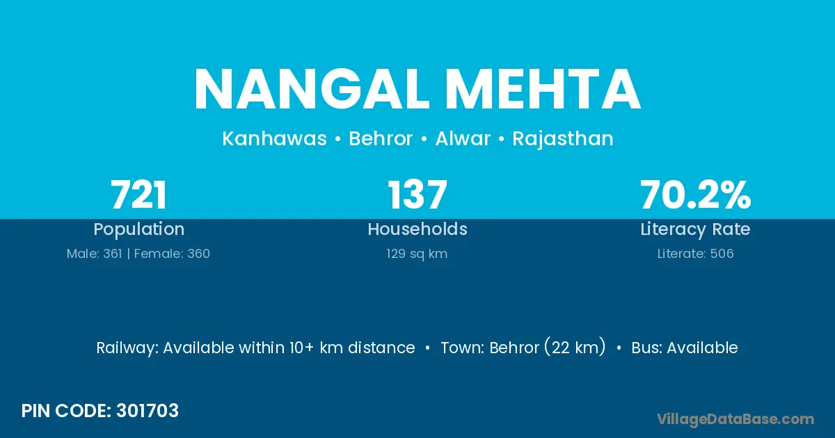 Behror (22 km) is the nearest town to Nangal Mehta village for major economic activities and is located approximately 22 km away.