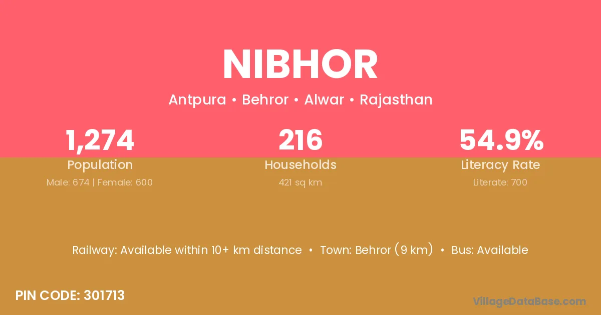 Behror (9 km) is the nearest town to Nibhor village for major economic activities and is located approximately 9 km away.