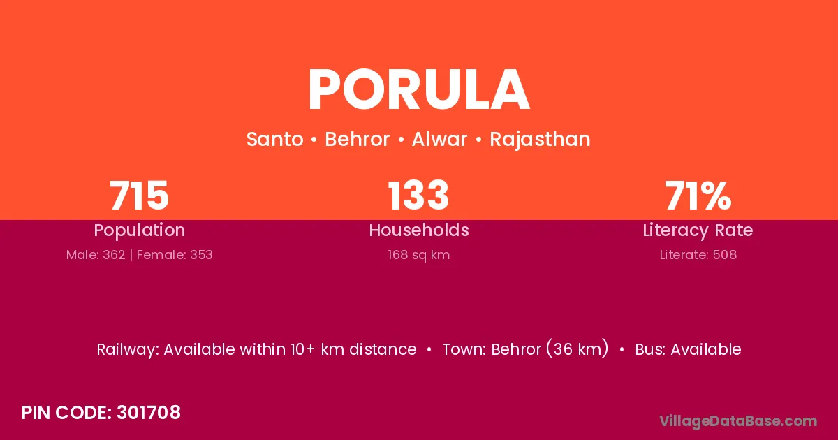 Behror (36 km) is the nearest town to Porula village for major economic activities and is located approximately 36 km away.