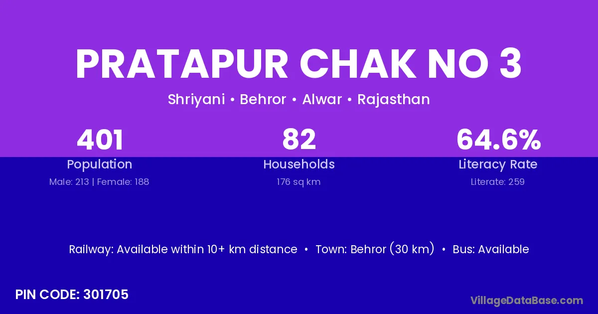 Behror (30 km) is the nearest town to Pratapur Chak No 3 village for major economic activities and is located approximately 30 km away.