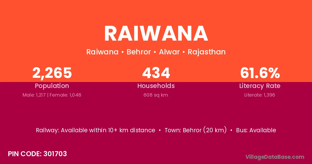 Behror (20 km) is the nearest town to Raiwana village for major economic activities and is located approximately 20 km away.