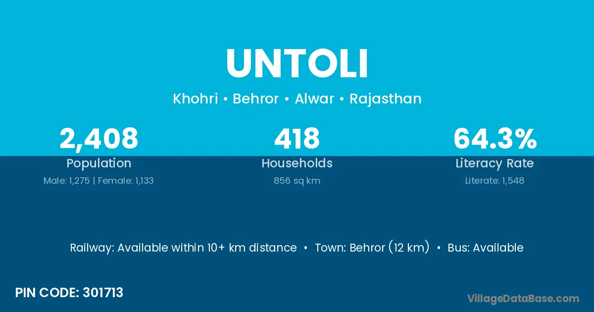 Behror (12 km) is the nearest town to Untoli village for major economic activities and is located approximately 12 km away.