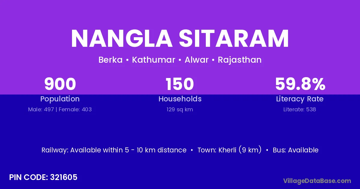 Kherli (9 km) is the nearest town to Nangla Sitaram village for major economic activities and is located approximately 9 km away.
