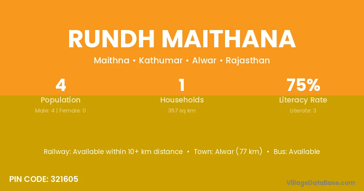Alwar (77 km) is the nearest town to Rundh Maithana village for major economic activities and is located approximately 77 km away.