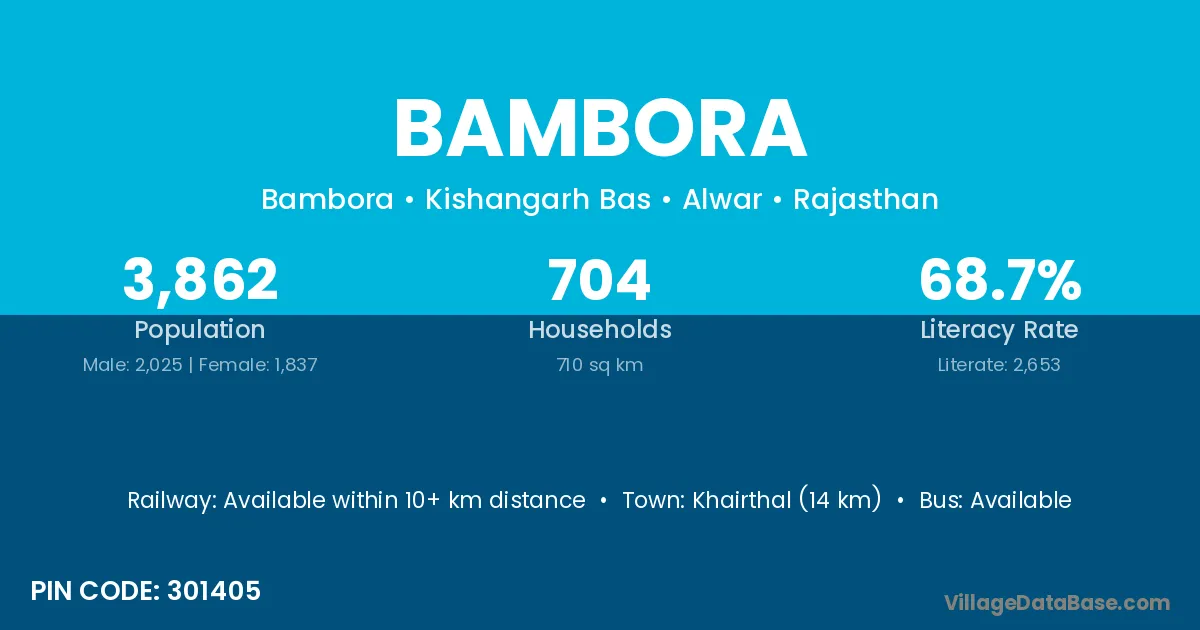 Khairthal (14 km) is the nearest town to Bambora village for major economic activities and is located approximately 14 km away.