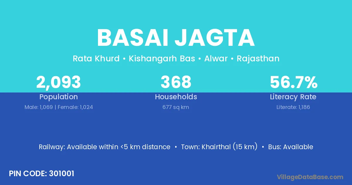 Khairthal (15 km) is the nearest town to Basai Jagta village for major economic activities and is located approximately 15 km away.