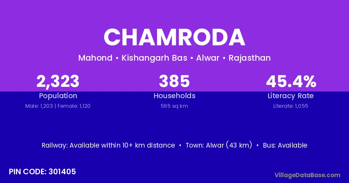 Alwar (43 km) is the nearest town to Chamroda village for major economic activities and is located approximately 43 km away.