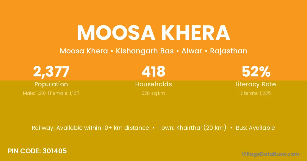 Khairthal (20 km) is the nearest town to Moosa Khera village for major economic activities and is located approximately 20 km away.