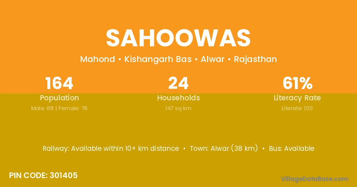 Alwar (38 km) is the nearest town to Sahoowas village for major economic activities and is located approximately 38 km away.
