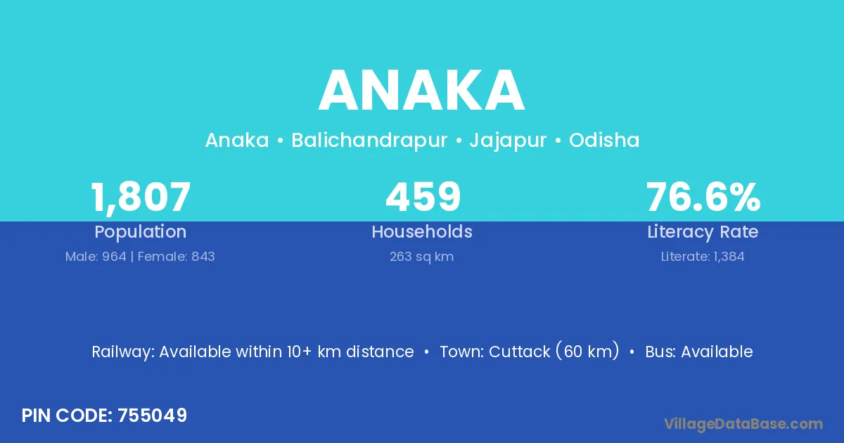 The literacy rate of Anaka village is 70.85%. Male literacy stands at 82.39% and female literacy at 58.82%.