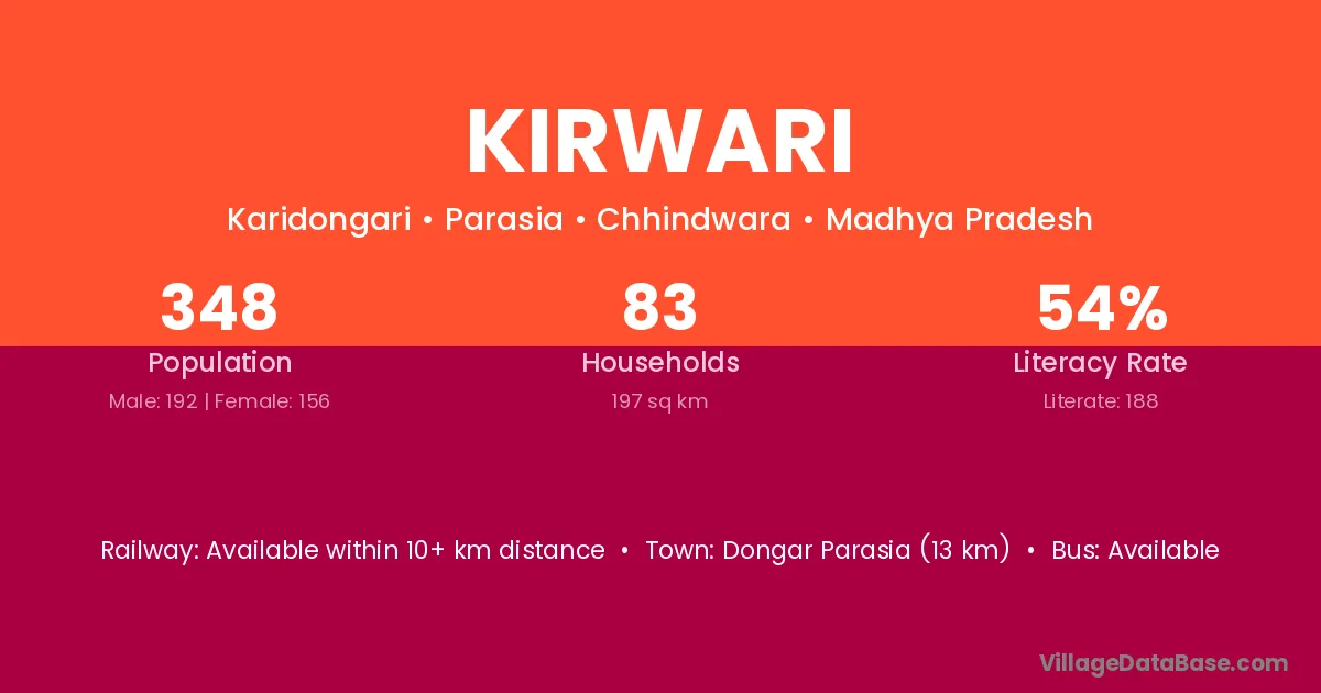 Kirwari village has a total population of 1,648 people, of which 849 are males and 799 are females.