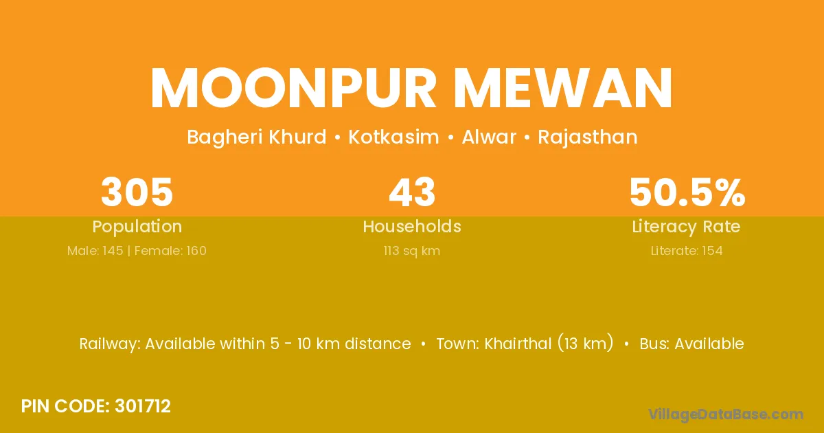 Khairthal (13 km) is the nearest town to Moonpur Mewan village for major economic activities and is located approximately 13 km away.