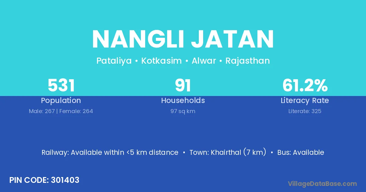 Nangli Jatan village has a total population of 531 people, of which 267 are males and 264 are females.
