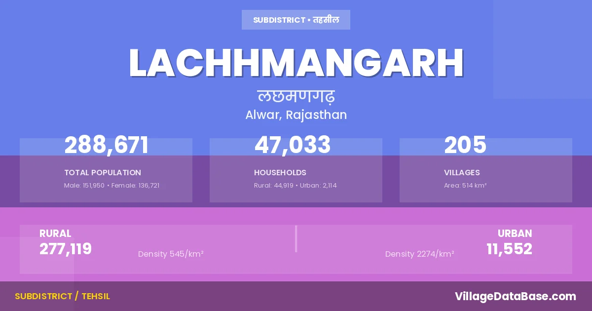 According to the 2011 census The total area of Lachhmangarh Tehsil is 514 km², with a population of 288671 people. The population density is 562 inhabitants per square kilometre, and there are approximately 47033 houses in the sub district.