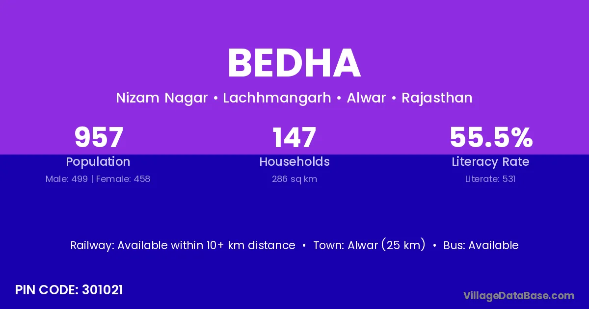Alwar (25 km) is the nearest town to Bedha village for major economic activities and is located approximately 25 km away.