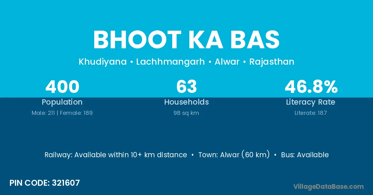 Alwar (60 km) is the nearest town to Bhoot Ka Bas village for major economic activities and is located approximately 60 km away.