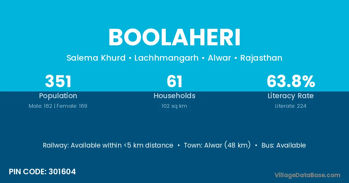 Alwar (48 km) is the nearest town to Boolaheri village for major economic activities and is located approximately 48 km away.