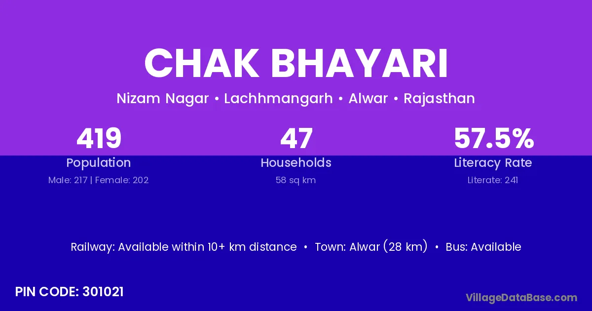 Alwar (28 km) is the nearest town to Chak Bhayari village for major economic activities and is located approximately 28 km away.