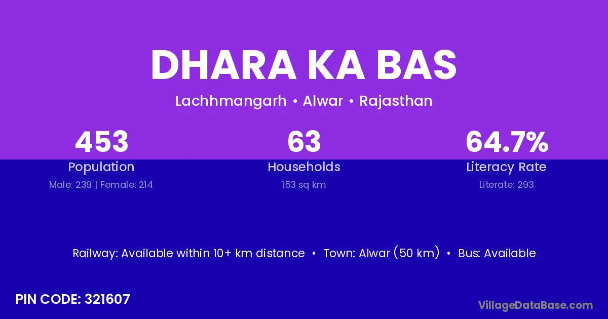 Dhara Ka Bas village has a total population of 453 people, of which 239 are males and 214 are females.