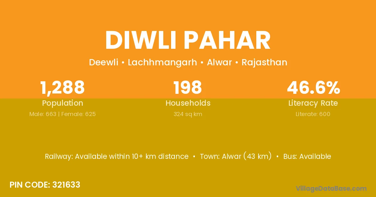 Alwar (43 km) is the nearest town to Diwli Pahar village for major economic activities and is located approximately 43 km away.