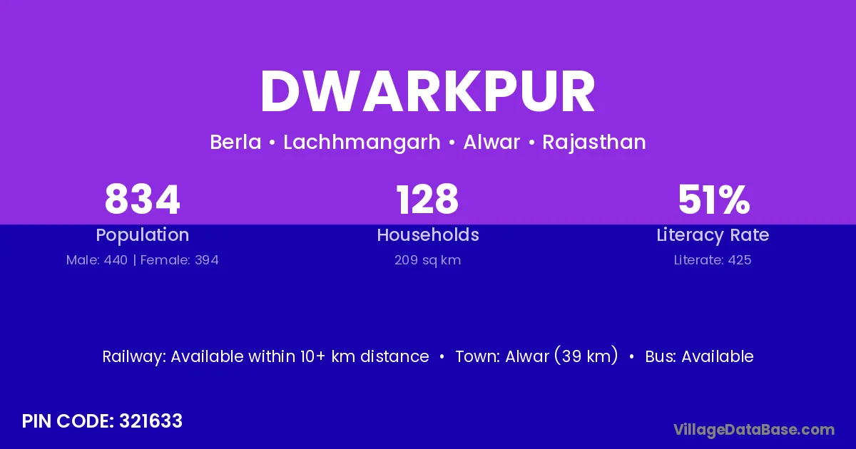 Alwar (39 km) is the nearest town to Dwarkpur village for major economic activities and is located approximately 39 km away.