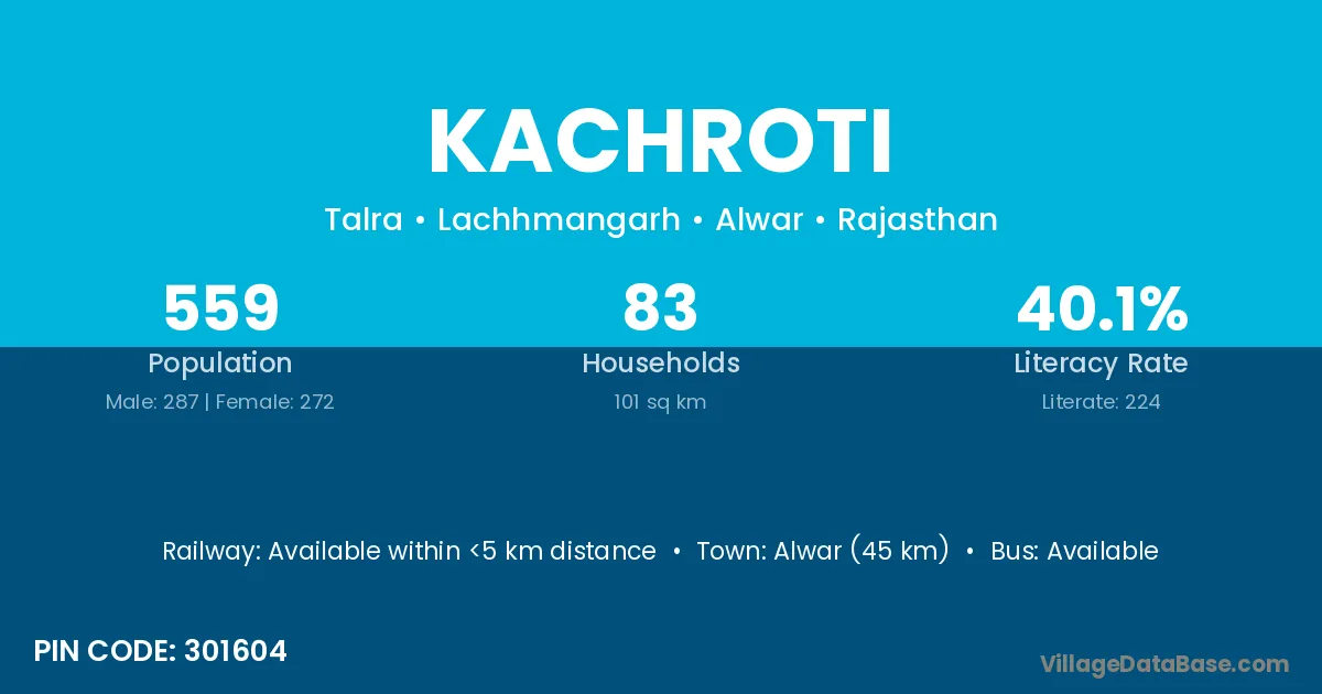 Alwar (45 km) is the nearest town to Kachroti village for major economic activities and is located approximately 45 km away.