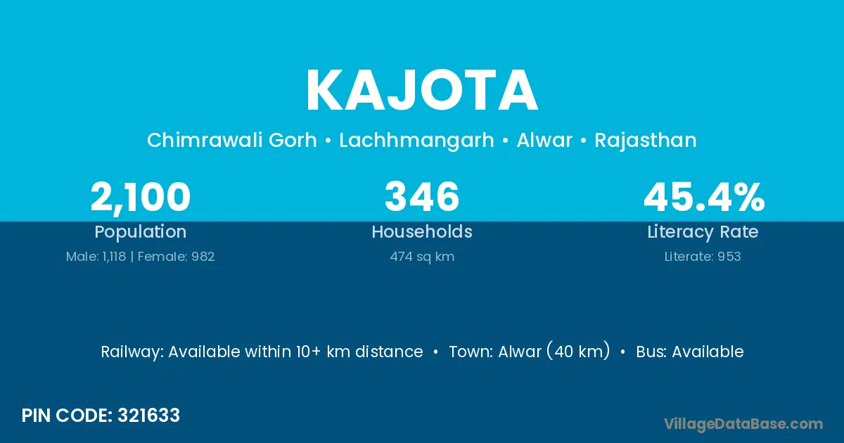 Alwar (40 km) is the nearest town to Kajota village for major economic activities and is located approximately 40 km away.