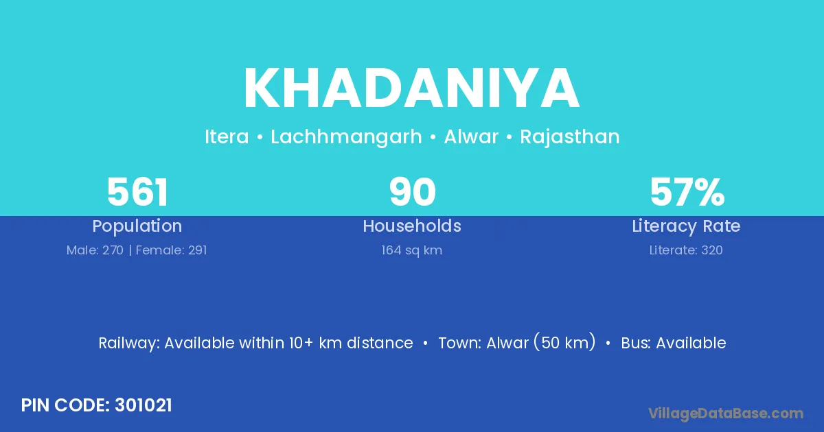 Alwar (50 km) is the nearest town to Khadaniya village for major economic activities and is located approximately 50 km away.