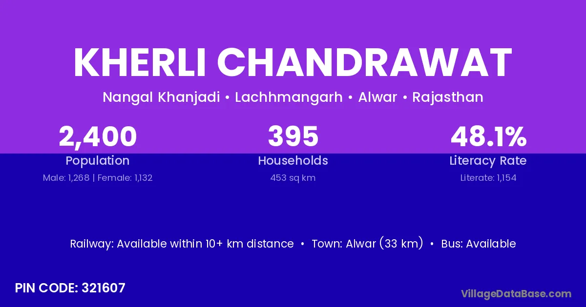 Alwar (33 km) is the nearest town to Kherli Chandrawat village for major economic activities and is located approximately 33 km away.