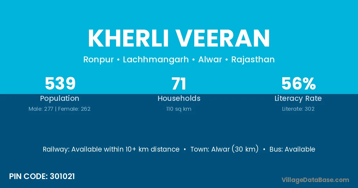 Alwar (30 km) is the nearest town to Kherli Veeran village for major economic activities and is located approximately 30 km away.
