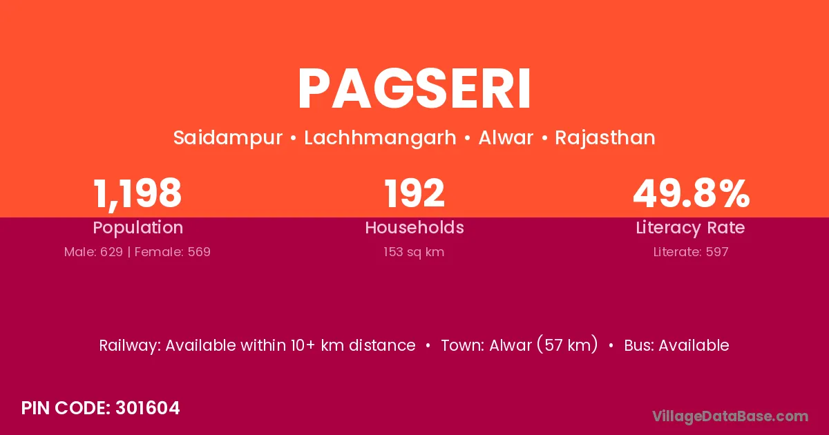 Alwar (57 km) is the nearest town to Pagseri village for major economic activities and is located approximately 57 km away.