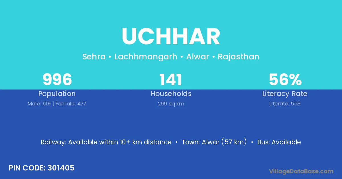 Alwar (57 km) is the nearest town to Uchhar village for major economic activities and is located approximately 57 km away.