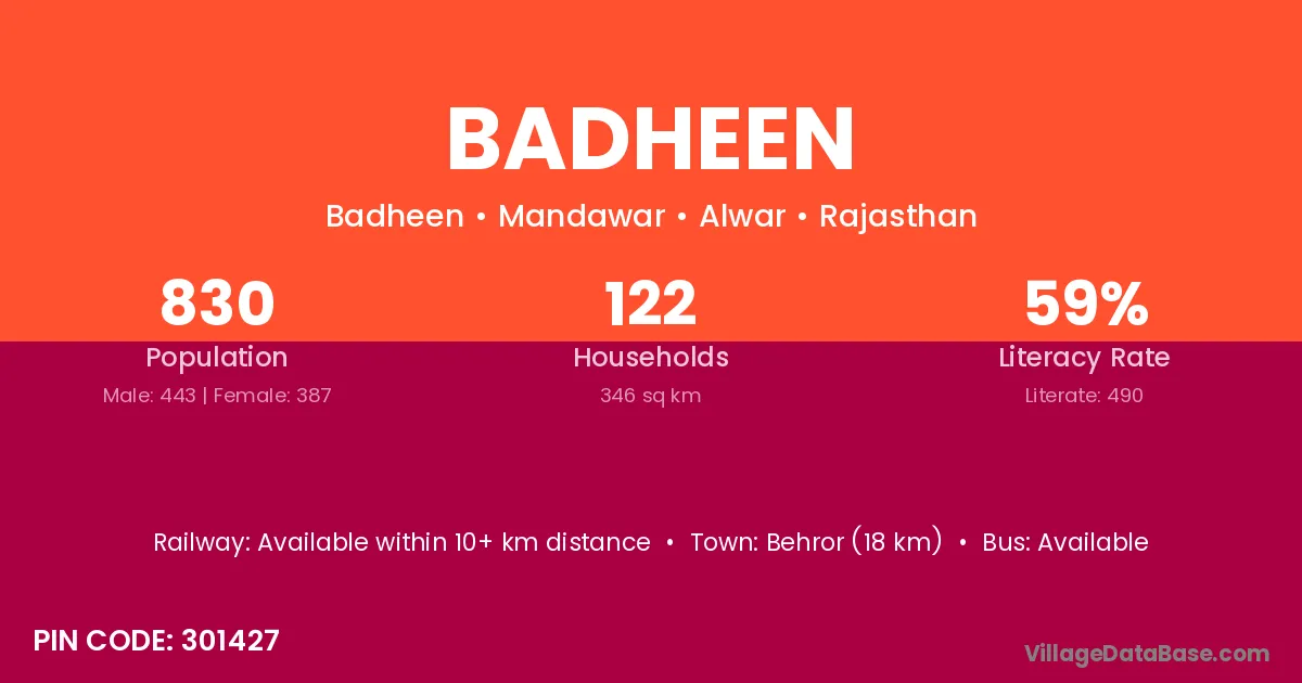 Behror (18 km) is the nearest town to Badheen village for major economic activities and is located approximately 18 km away.