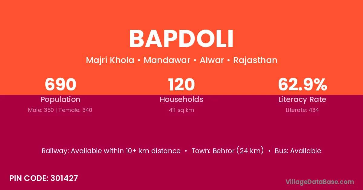 Behror (24 km) is the nearest town to Bapdoli village for major economic activities and is located approximately 24 km away.